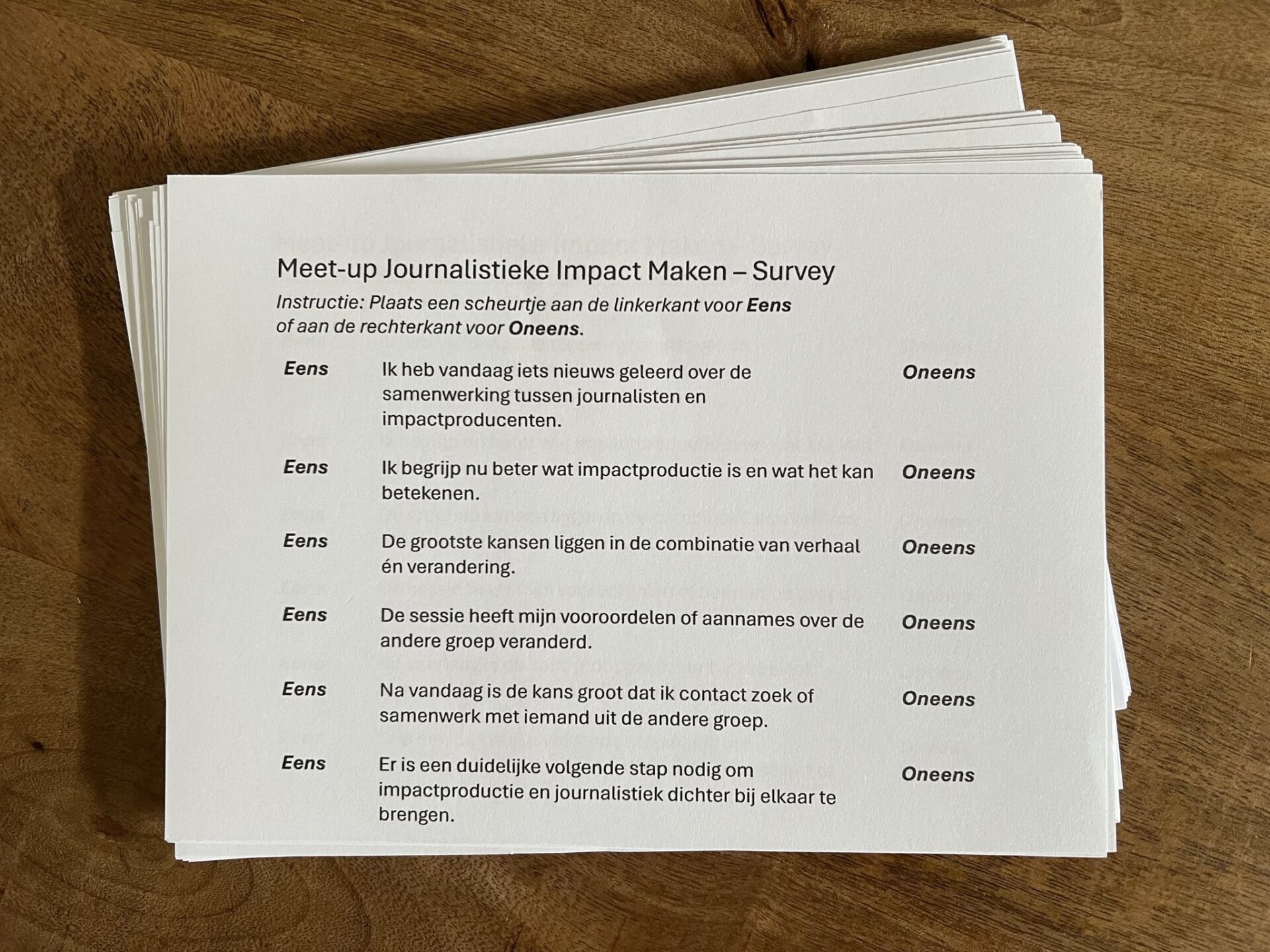 Op het Nederlands Journalistiek Festival in Deventer ontmoetten journalisten en impactproducenten elkaar voor het eerst bewust. Met stellingen, oefeningen en een live “first date” vervaagde de oude grens tussen ‘verhaal’ en ‘verandering’. De survey sprak boekdelen: 93% ziet kansen in samenwerking en bijna de helft overweegt die stap nu zelf. Deventer markeerde het begin van een beweging waarin beide werelden elkaar versterken. Foto door Vera Duivenvoorden.