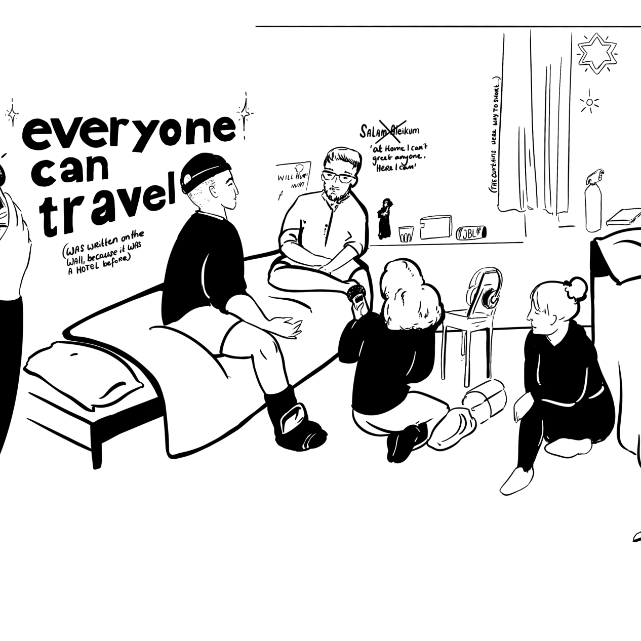 Iedereen kan reizen is gemaakt in samenwerking met SAWA Collective, een stichting voor jongvolwassenen asielzoekers en De Voorkamer, een ontmoetingsplek voor nieuwkomers en inwoners van Utrecht: