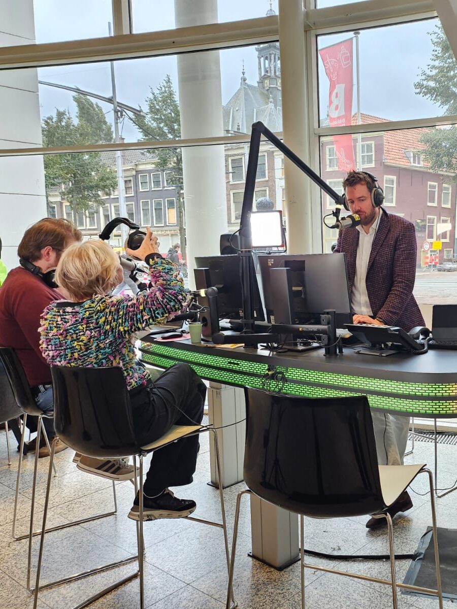 Logistiek heeft de studio in hartje Den Haag grote voordelen. ‘We delen een locatie met Omroep West in Ypenburg, ver buiten het centrum. Dat is best ver weg, waardoor er weinig tot geen contact is met ons publiek. Doordat we in de bieb zitten, creëren we zichtbaarheid – een band – met onze luisteraars. Bovendien is het ideaal voor onze gasten. Zeker voor die uit de politiek, we zitten immers naast het stadhuis.’